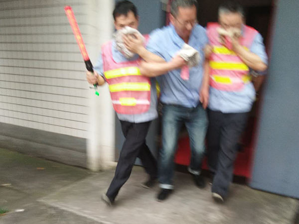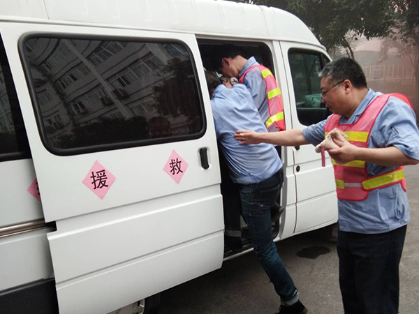 11點30分,警鈴響起,突起煙霧迷漫,員工們在疏散引導員的帶領下,利用濕毛巾捂住口鼻,迅速從預定的消防安全通道撤離,有秩序、快速的向指定地方疏散,搜救人員順利將負傷員工搶救至指定救護車輛上、整個疏散、救護過程為3分鐘,整個演練為時30分鐘。